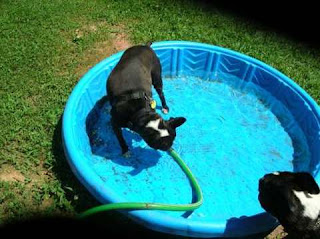 Many boston terriers love kiddie pools. For a fun break from the air conditioning and a chance to experience the great outdoors, consider investing in a pool. Be sure to dump the water after each swim to avoid mosquitoes. Here is Miss Peanut enjoying pool time. No coaxing required - pull the pool out and she is in it.